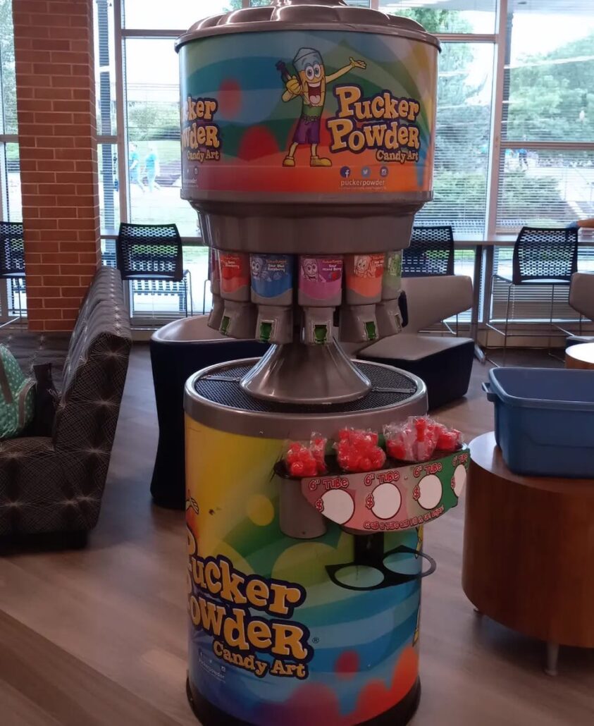 CANDY ART/ PUCKER POWDER EVENT DESCRIPTION 4.5’ X 2.5’ X 5.5’ SELF CONTAINED CANDY DISPENSING MACHINE WITH 9 FLAVORS SPACE REQUIREMENTS 10’ X 10’ X 8’ 4 ELECTRICAL REQUIREMENTS NONE ORGANIZATION MUST PROVIDE ONE TRASH CAN, ONE BANQUET TABLE ADDITIONAL INFORMATION MACHINE CANNOT BE BROUGHT UP STAIRS