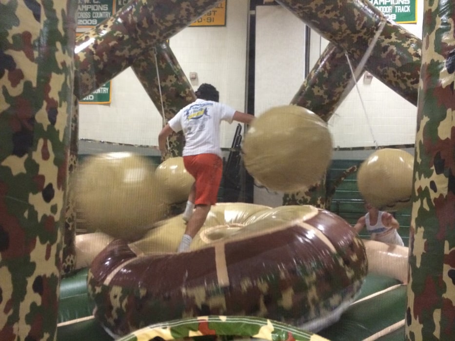 EVENT DESCRIPTION: 19.5’X19.5X13’ TALL VINYL INFLATABLE WITH CENTRAL PEDESTAL AND FOAM BALL SUSPENDED FROM CEILING