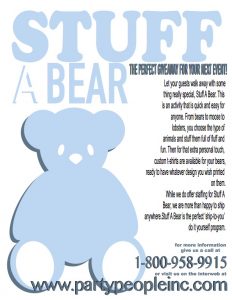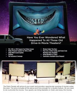 Party People Inc., can provide entertainment for your local town camp programs, large town gatherings, and weekend themed events at RV campgrounds. Party People Inc., has every type of entertainment from Drive in Movie Nights to Stuff a Bear and Inflatables, every event you need to keep your guest entertained. Click the links below to learn more about our featured products, our specials of the month, our custom packages and do it yourself events.